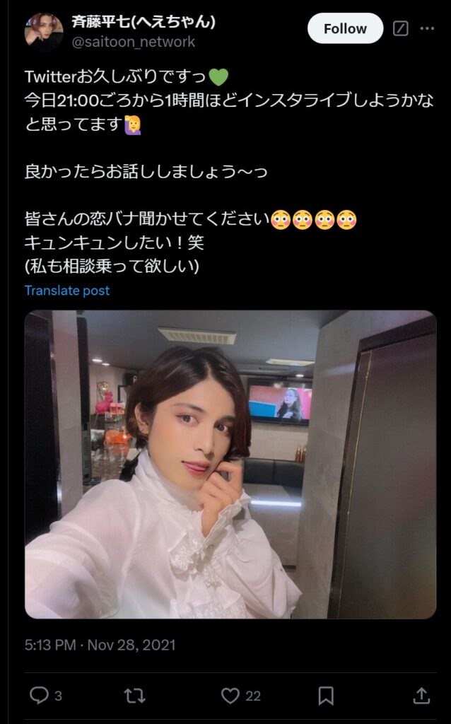 モデルのへえ(斉藤平七)さんは、自らのSMSにおいてゲイであることを告白しています。以前からへえさんは、オネエタレントの「ぺえさん」と同居していたことで有名ですが、同居している間二人に恋愛関係はなかったのだそうです。