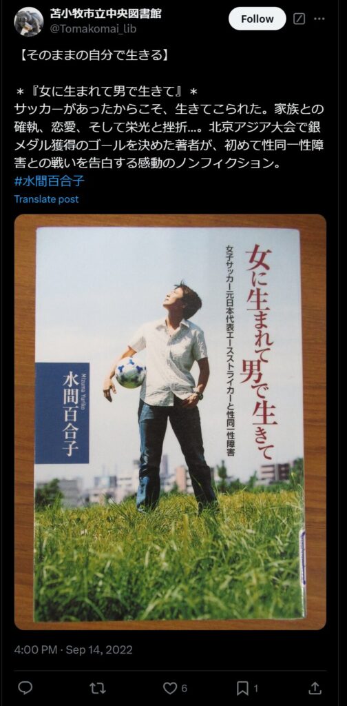 元女子サッカー選手の水間百合子さんは、2006年に「女で生まれて男で生きて」というエッセイを出版し、性同一性障害であることをカミングアウトしました。