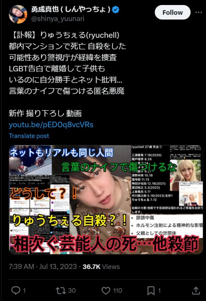 その後2023年にryuvhellさんは自殺してしまいますが、自殺理由は離婚時に「子供が可哀そう」「無責任」など多くの誹謗中傷がSNSによせられたことによるといわれています。ryuchellさんの自殺は、日本の性的マイノリティーに対する認識不足が原因の1つとして問題となりました。