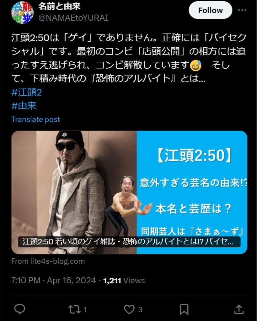 際どい芸風を持ち味としている江頭2:50さんですが、バイセクシャルであるといわれています。そもそも江頭2:50の芸名由来は、その時間帯になると「同性愛者のようなふるまいに変身する」ことから名付けたのだそう。