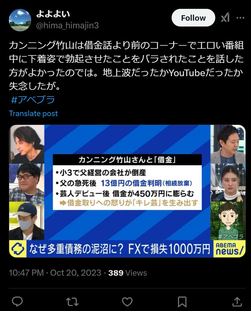 お笑い芸人のカンニング竹山さんは、父の土地ころがしによる負債13億円を背負った過去があります。竹山さんの父は貿易会社や食品工場など様々な事業を営んでいましたが、バブル期には土地ころがしで非常に儲かっていたそうです。しかしバブルがはじけて焦げ付いてしまい、ショックにより父も脳溢血で倒れ帰らぬ人となってしまったといいます。